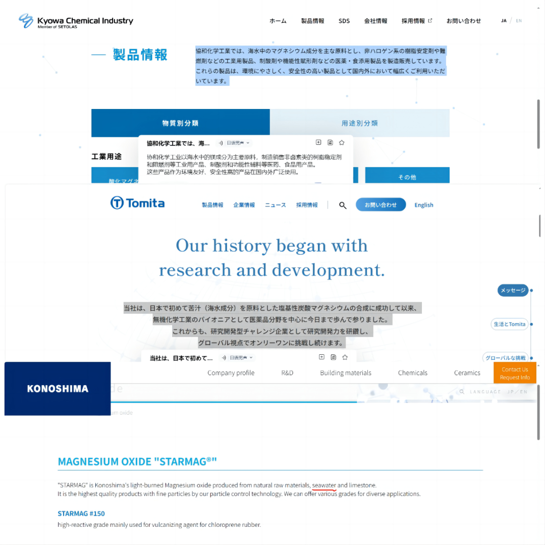 圖為相關日本公司官網將海水法制鎂鹽作為宣傳