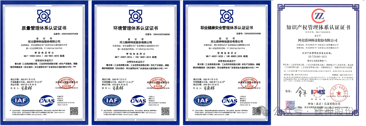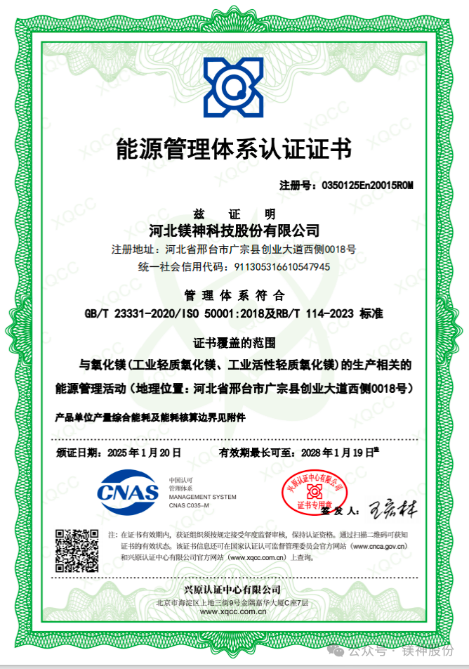 近日,河北鎂神科技股份有限公司獲能源管理體系認(rèn)證證書,成為行業(yè)內(nèi)首家通過這一重要認(rèn)證的企業(yè)。這標(biāo)志著公司在能源管理體系建設(shè)方面達(dá)到了新的里程碑,進(jìn)一步鞏固了其在氧化鎂行業(yè)的領(lǐng)先地位。